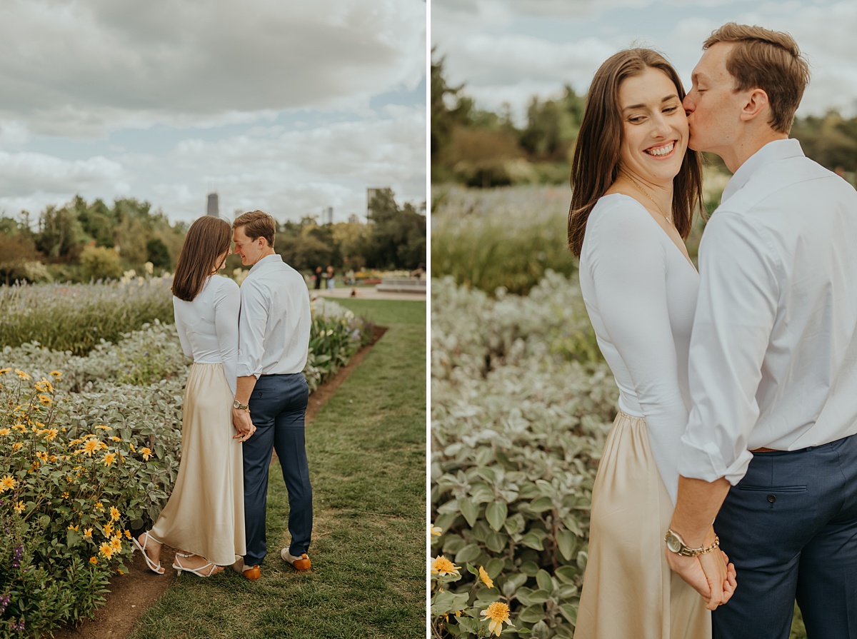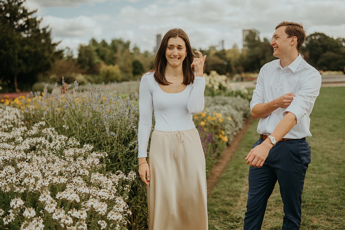 Erin & Nick’s spring Chicago proposal was full of joy, love, and fresh beginnings. The city was just starting to wake up from winter, with green trees, blooming flowers, and warmer air all around. Chicago made the perfect backdrop for such a special moment, blending big-city energy with soft spring beauty. Erin definitely had an idea that Nick was about to pop the question. And as life has it, right where they were standing, a trolley comes by screaming congratulations… BEFORE Nick got down on one knee haha As perfect as things may go, theres always something silly that happens.